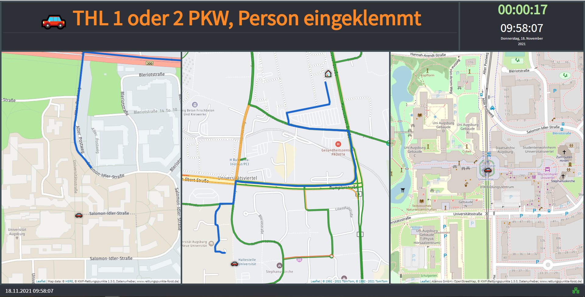 Unsere Kartendienste ermöglichen es Ihnen, einen schnellen Überblick über den aktuellen Einsatzort zu erhalten. Verschiedene Kartenquellen können in unterschiedlichen Darstellungsvarianten genutzt werden. Auch eine Routenanzeige und die Integration von beliebigen Markern (Hydranten, etc.) ist jederzeit möglich.