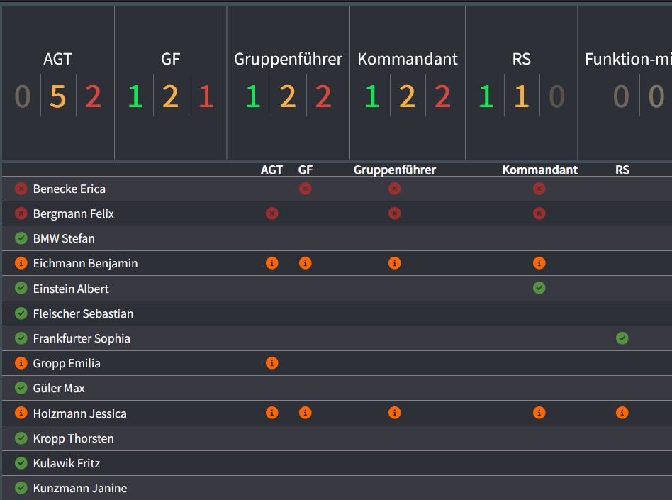 Unsere Statusansicht ermöglicht es Ihnen, jederzeit den Status Ihrer oder anderer Fahrzeuge im Blick zu haben. Bei Alarmierung nutzen Sie entweder die AAO der Leitstelle oder hinterlegen Sie hier eigene AAO. Fahrzeuge, Stichwörter, Tageszeit und Ortsbezug fließen in die Berechnung der jeweils gültigen AAO mit ein.