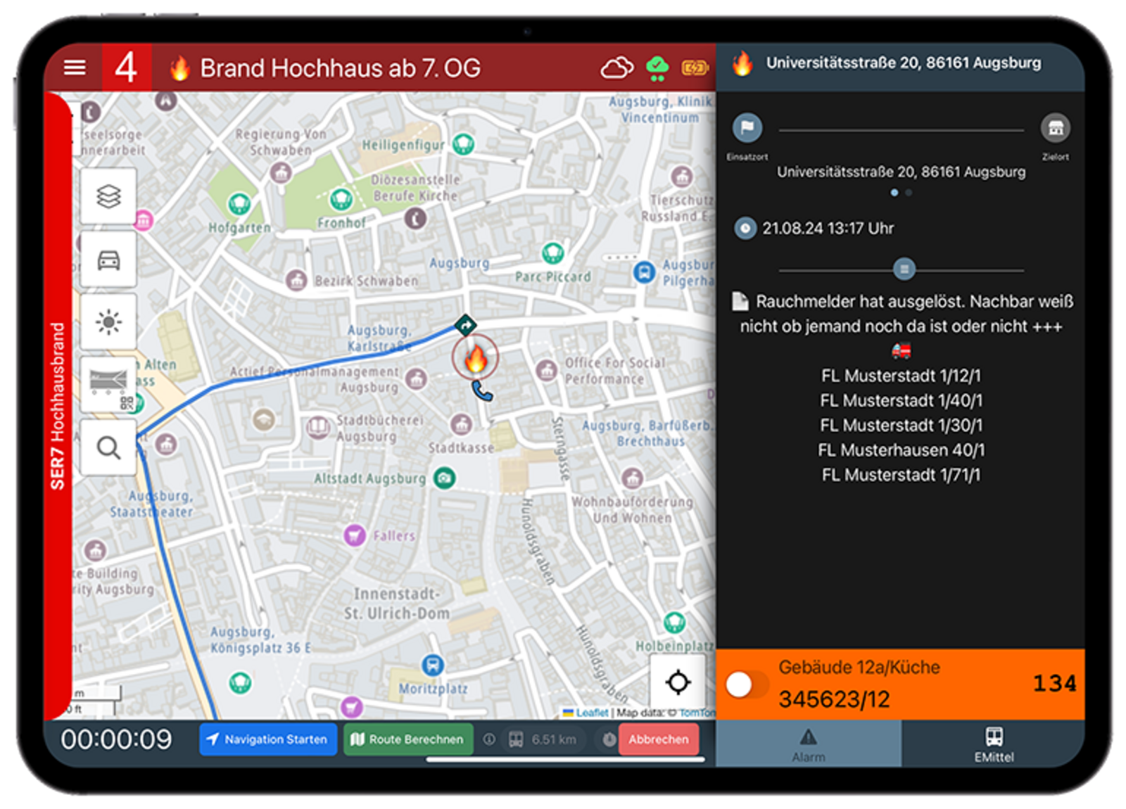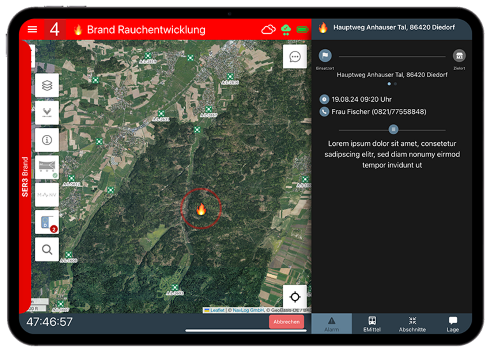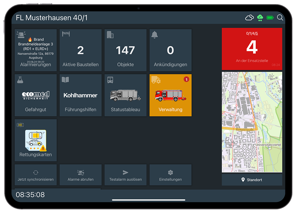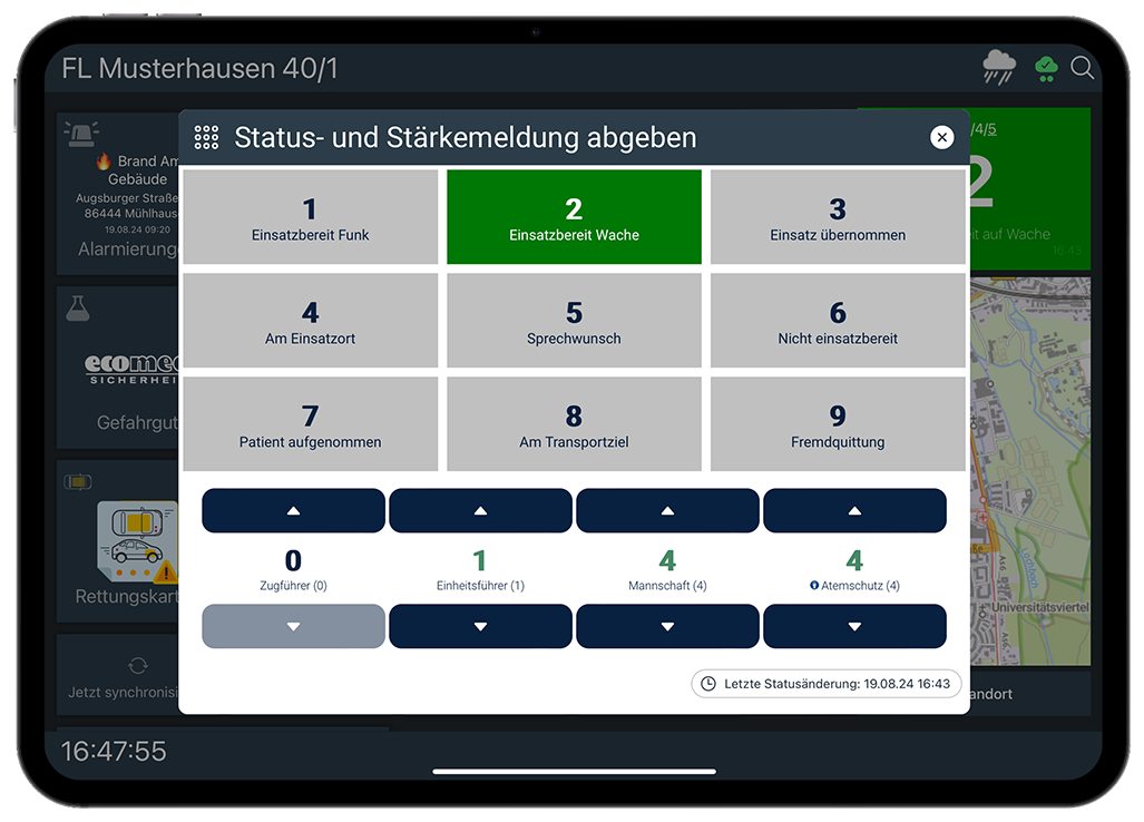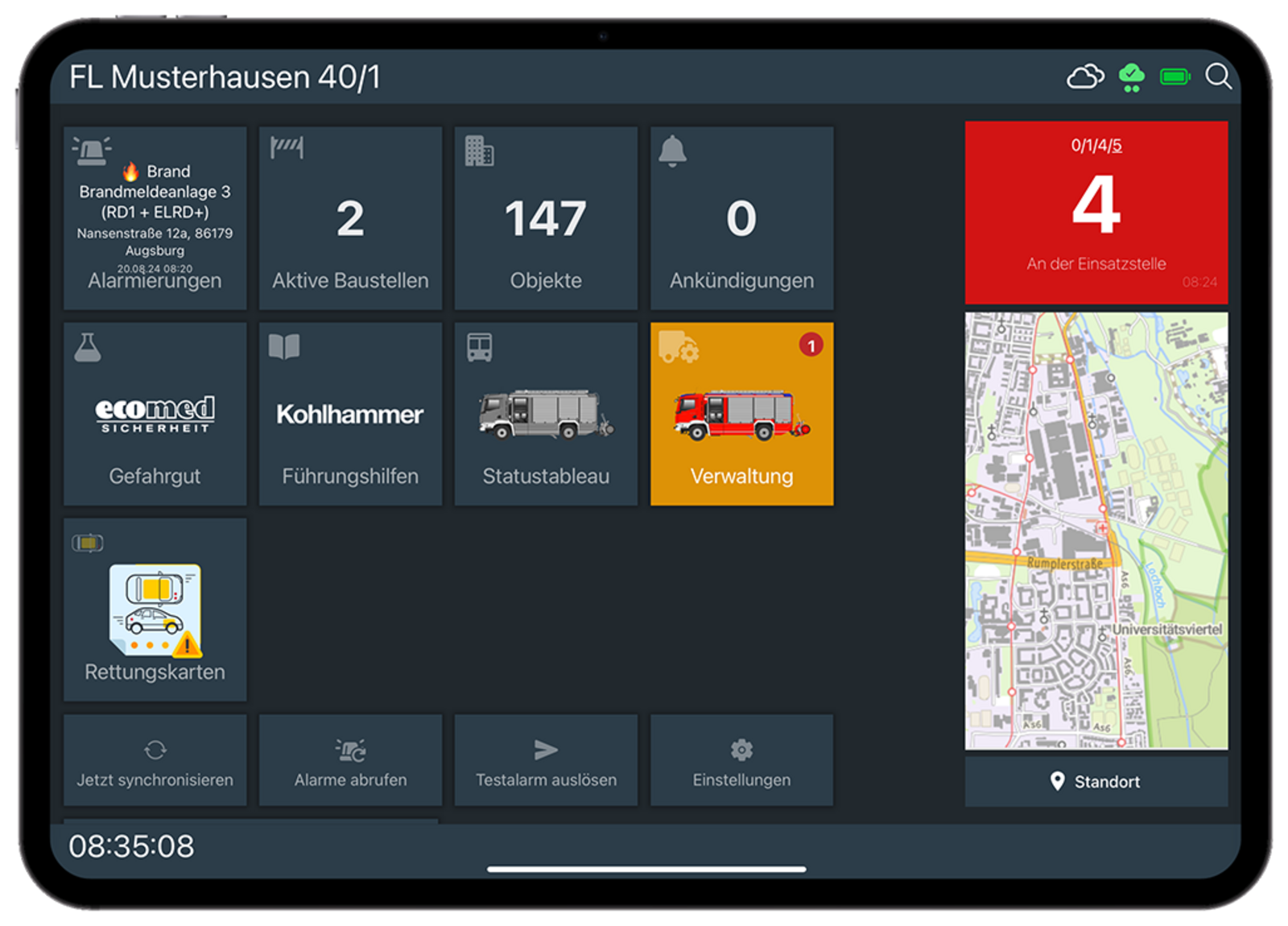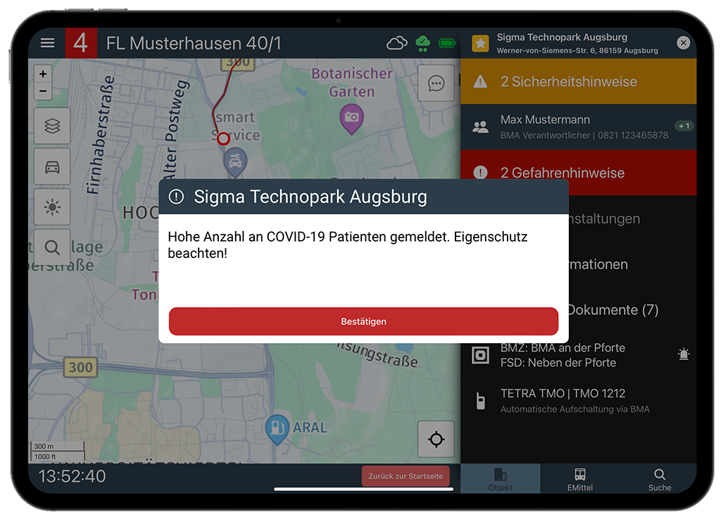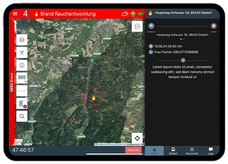 Der aMobile PRO ermöglicht es Ihnen, einfach und übersichtlich alle relevanten Informationen zu einem anstehenden Einsatz anzeigen zu lassen. In der übersichtlichen Oberfläche haben Sie Zugriff auf den aktuellen Status (FMS und TETRA), das Einsatzstichwort, die Zieladresse und sonstige Informationen. Sollte die Alarmierung von einer Brandmeldeanlage empfangen worden sein, so kann der aMobile PRO weiterführende Informationen dazu darstellen – inklusive einer vorhandenen Laufkarte.