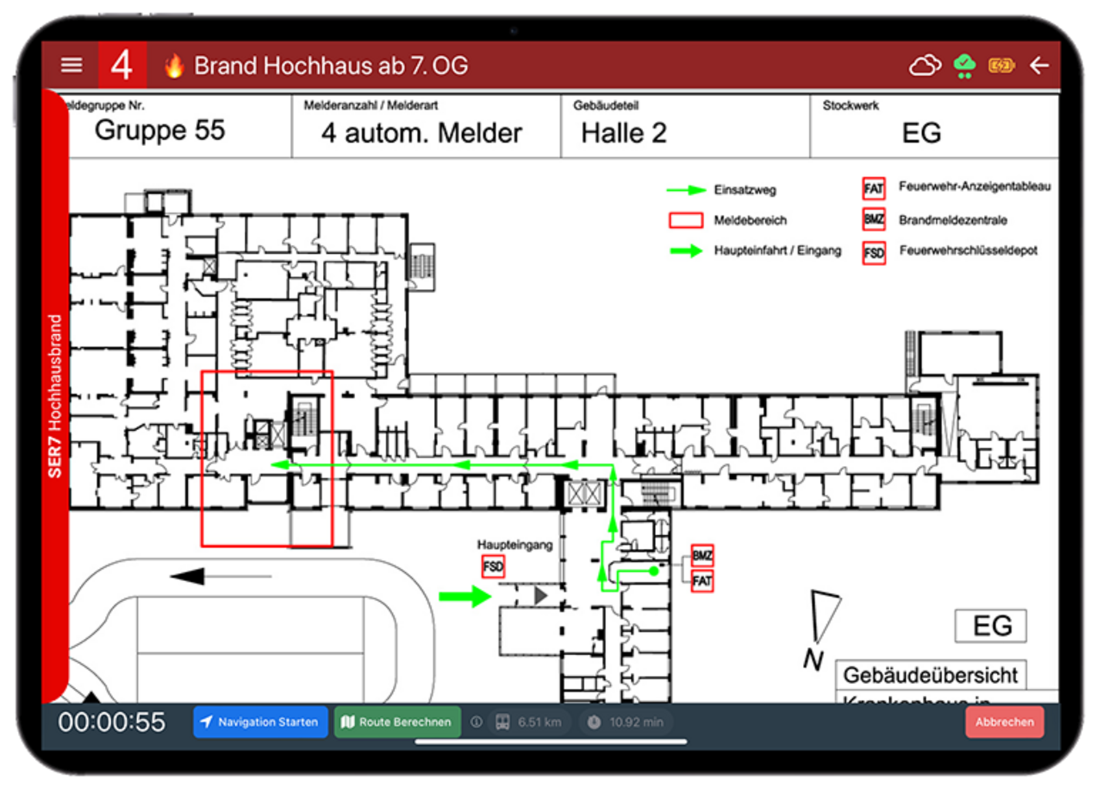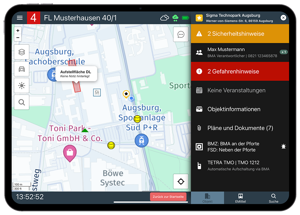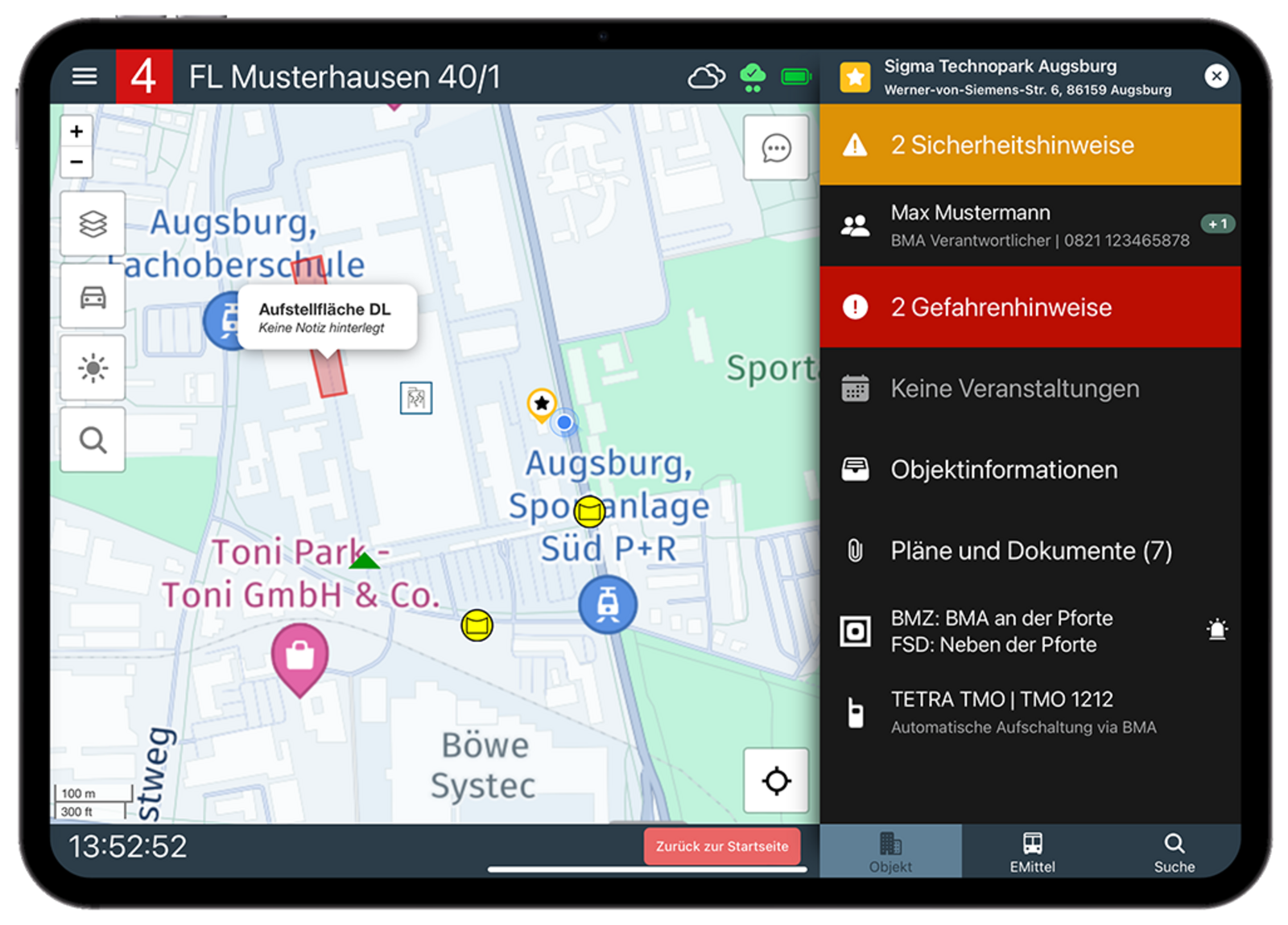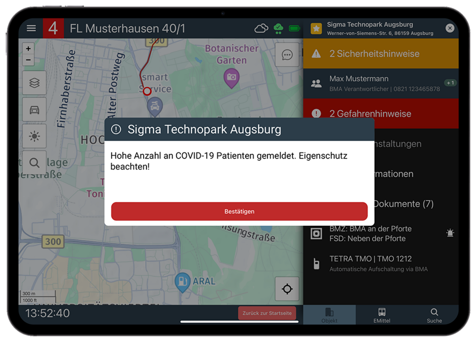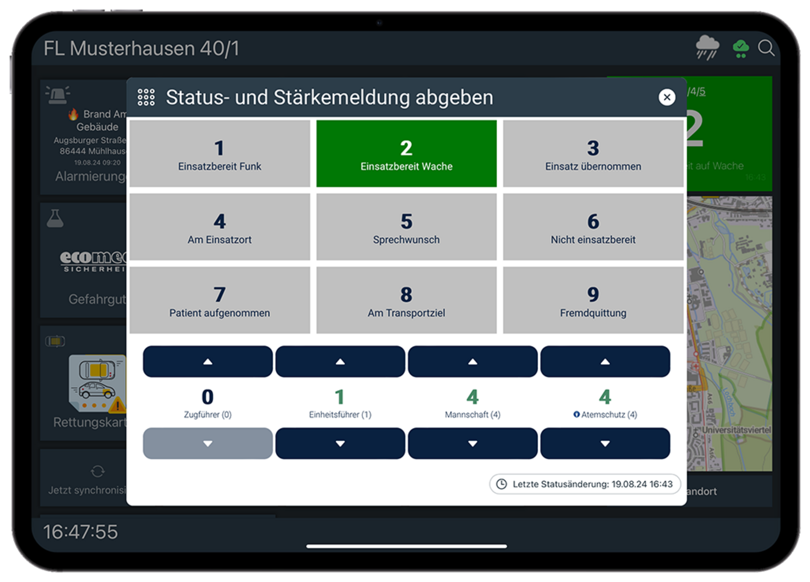 Der aMobile PRO ermöglicht es Ihnen, einfach und übersichtlich alle relevanten Informationen zu einem anstehenden Einsatz anzeigen zu lassen. In der übersichtlichen Oberfläche haben Sie Zugriff auf den aktuellen Status (FMS und TETRA), das Einsatzstichwort, die Zieladresse und sonstige Informationen. Sollte die Alarmierung von einer Brandmeldeanlage empfangen worden sein, so kann der aMobile PRO weiterführende Informationen dazu darstellen – inklusive einer vorhandenen Laufkarte.