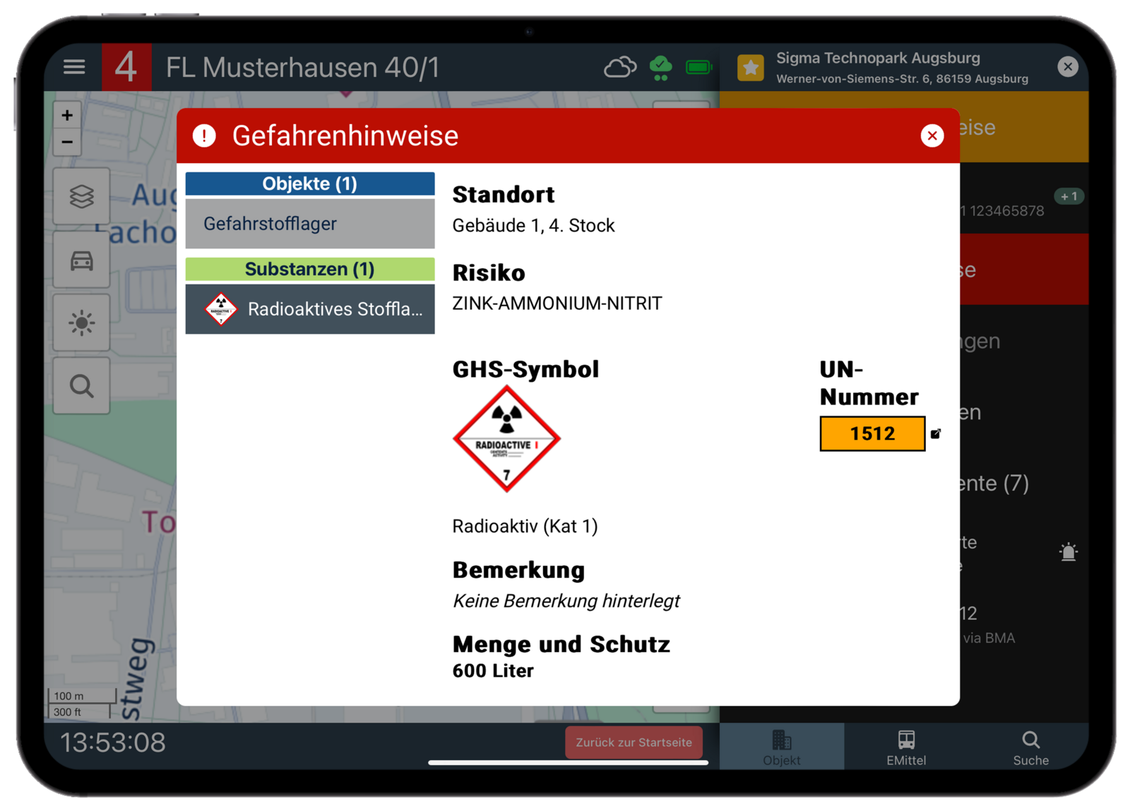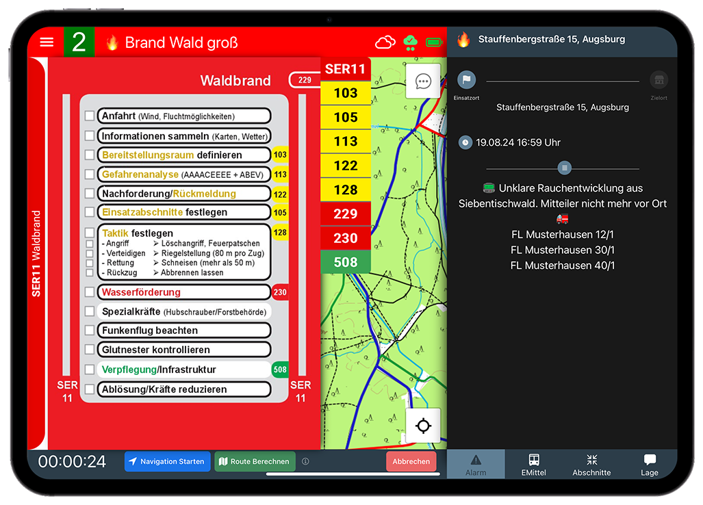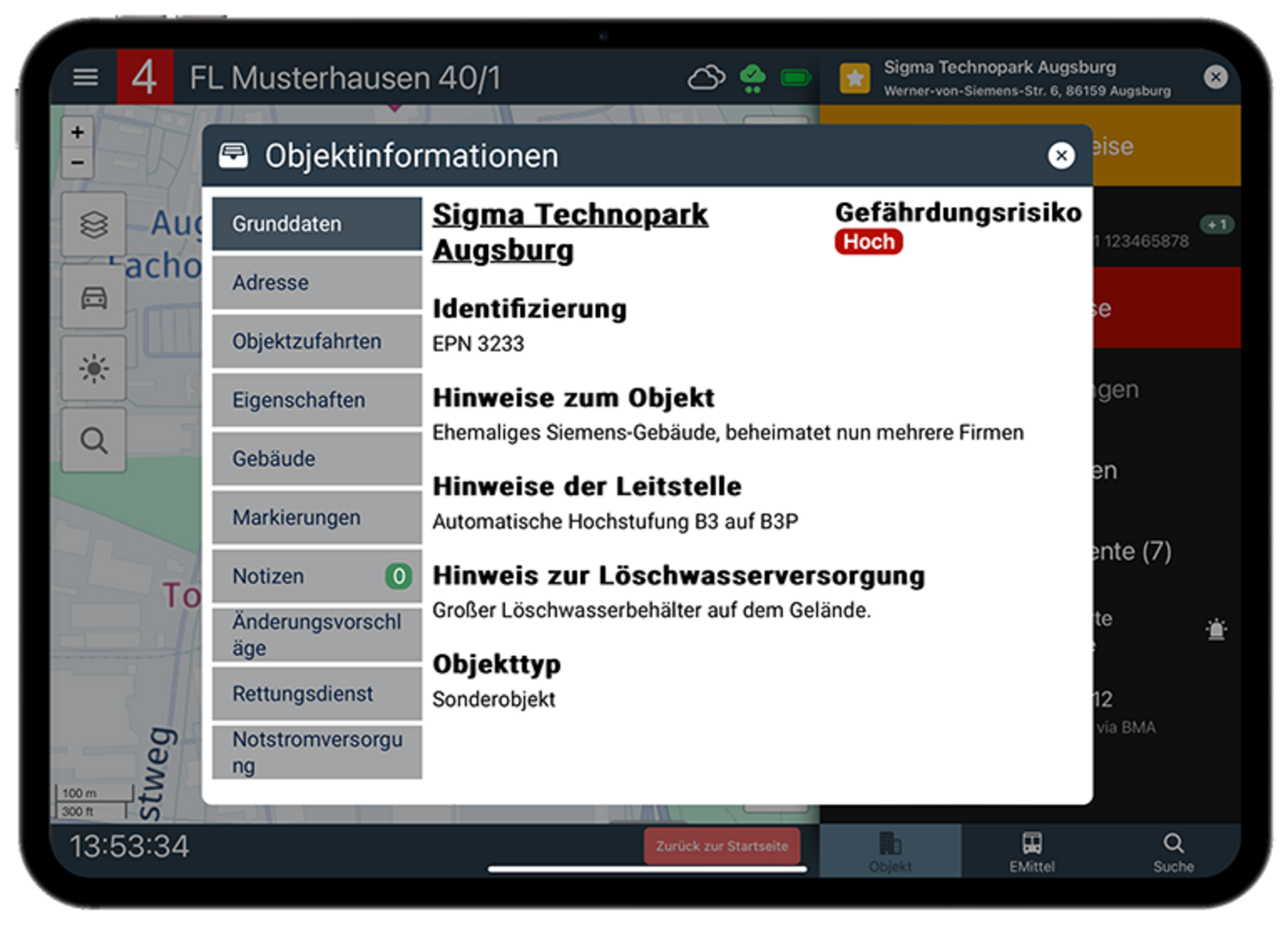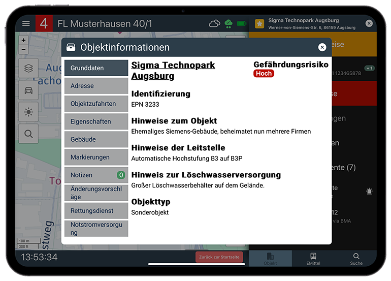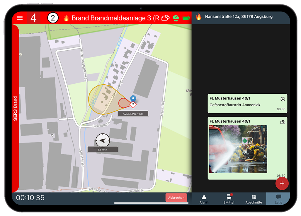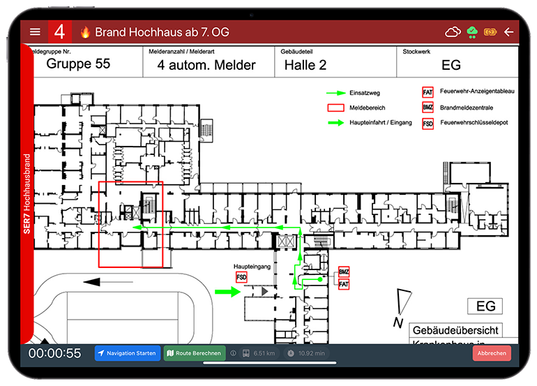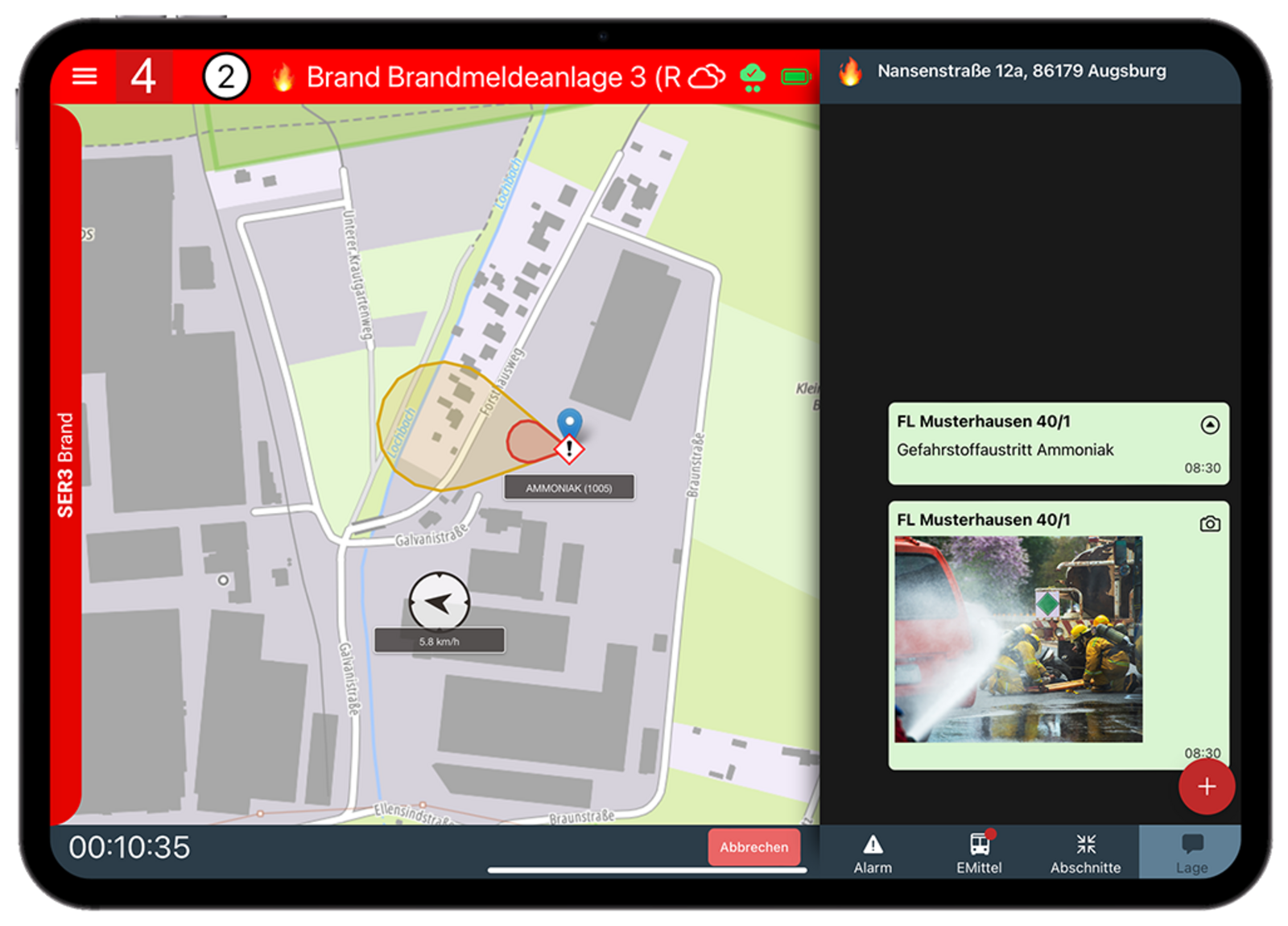 Der aMobile PRO ermöglicht es Ihnen, einfach und übersichtlich alle relevanten Informationen zu einem anstehenden Einsatz anzeigen zu lassen. In der übersichtlichen Oberfläche haben Sie Zugriff auf den aktuellen Status (FMS und TETRA), das Einsatzstichwort, die Zieladresse und sonstige Informationen. Sollte die Alarmierung von einer Brandmeldeanlage empfangen worden sein, so kann der aMobile PRO weiterführende Informationen dazu darstellen – inklusive einer vorhandenen Laufkarte.